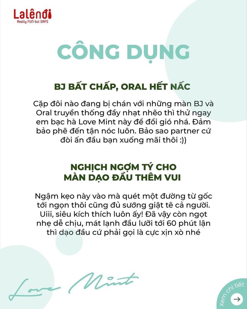 Kẹo này thì khỏi chê, đúng kiểu được sáng chế ra để dành cho Oral hay BJ ấy. Cá nhân anh đã từng test suông nhiều loại, nhưng phần lớn loại được vị mint mạnh thì lại mau tan, loại thì lại chỉ mát lạnh lúc đầu về sau thì lại siêu ngọt khó chịu… Nhưng đúng là đến khi thử Love Mint này thì ấn tượng luôn, danh bất hư truyền, mát lạnh từ đầu tới cuối, đảm bảo cả 2 người cùng thích & sướng đê mê, mà khó có loại nào khác có thể mang lại. Mọi người cứ tưởng tượng cảm giác đang ấm nóng rồi đi từ trên ngực xuống vùng bụng, tiếp xuống phía dưới ngậm 1 phát hương bạc hà mát lạnh, rồi quết vài đường từ dưới gốc lên trên ngọn, rồi lại xoay xung quanh rồi ngậm và sử dụng lưỡi đá lung tung, tê rồi phêeeeeeee. Huhu